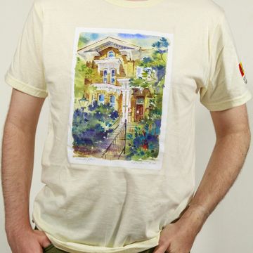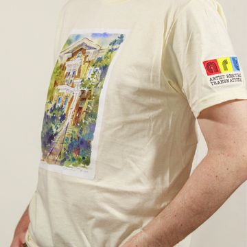 Enjoy this graphic tee with Craig Lueck's sublime watercolor rendition of the David Barnett Gallery on the front and the A.R.T. logo on the sleeve!